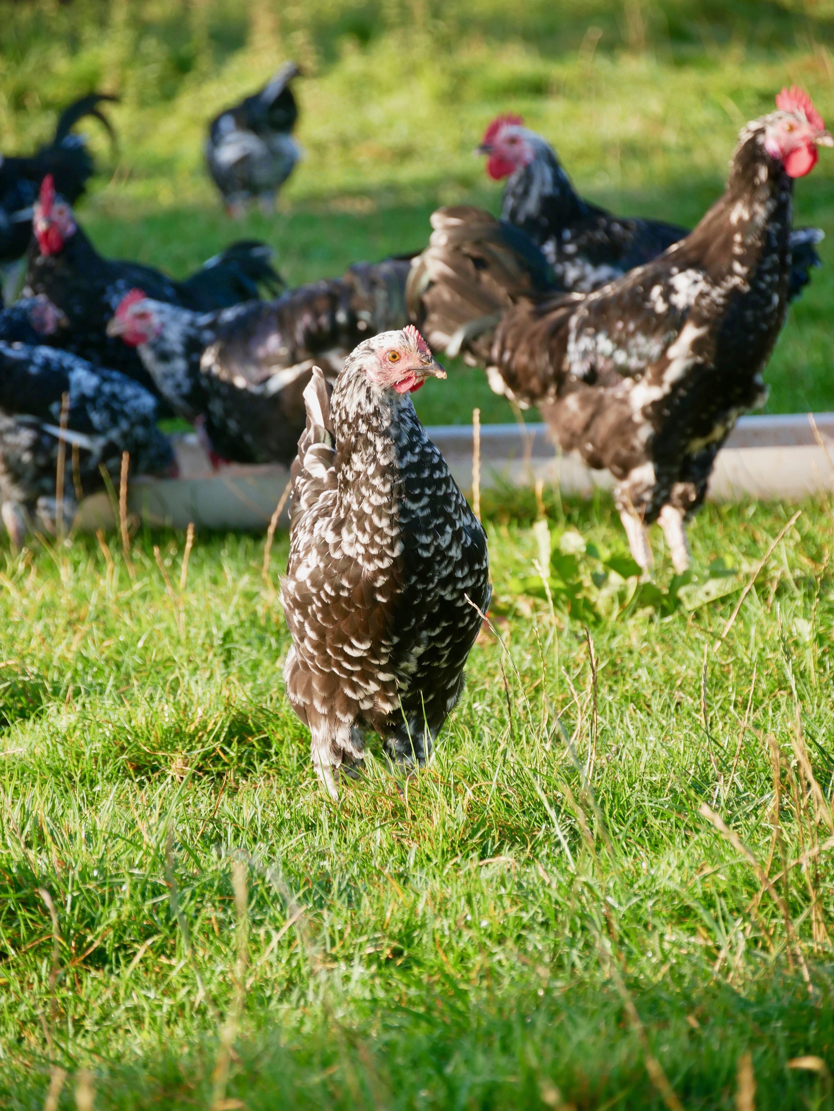 Les poulets sont de race Gournay, une race ancienne de Normandie à la chaire très parfumée. Ils sont élevés au minimum environ 120 jours.