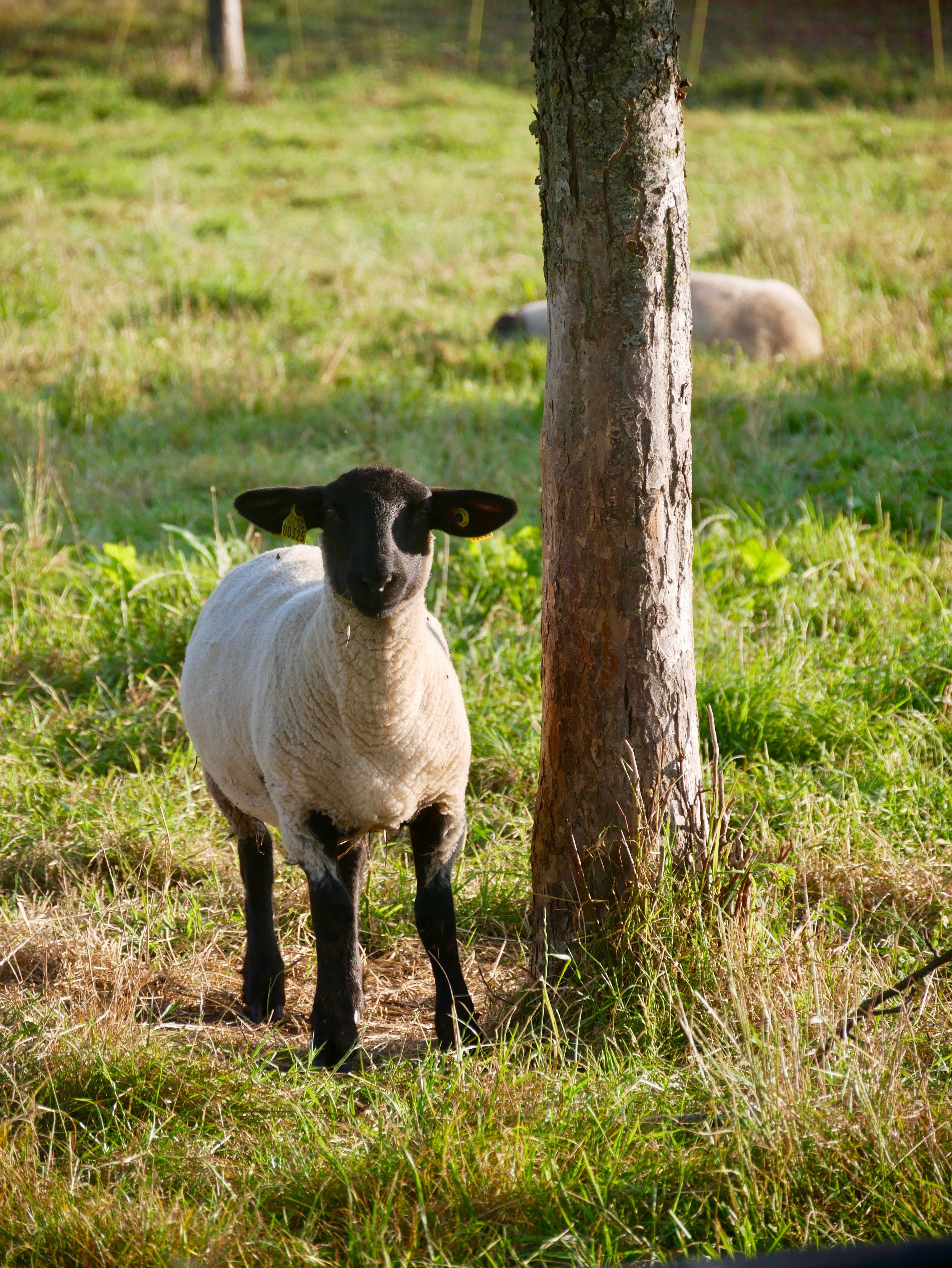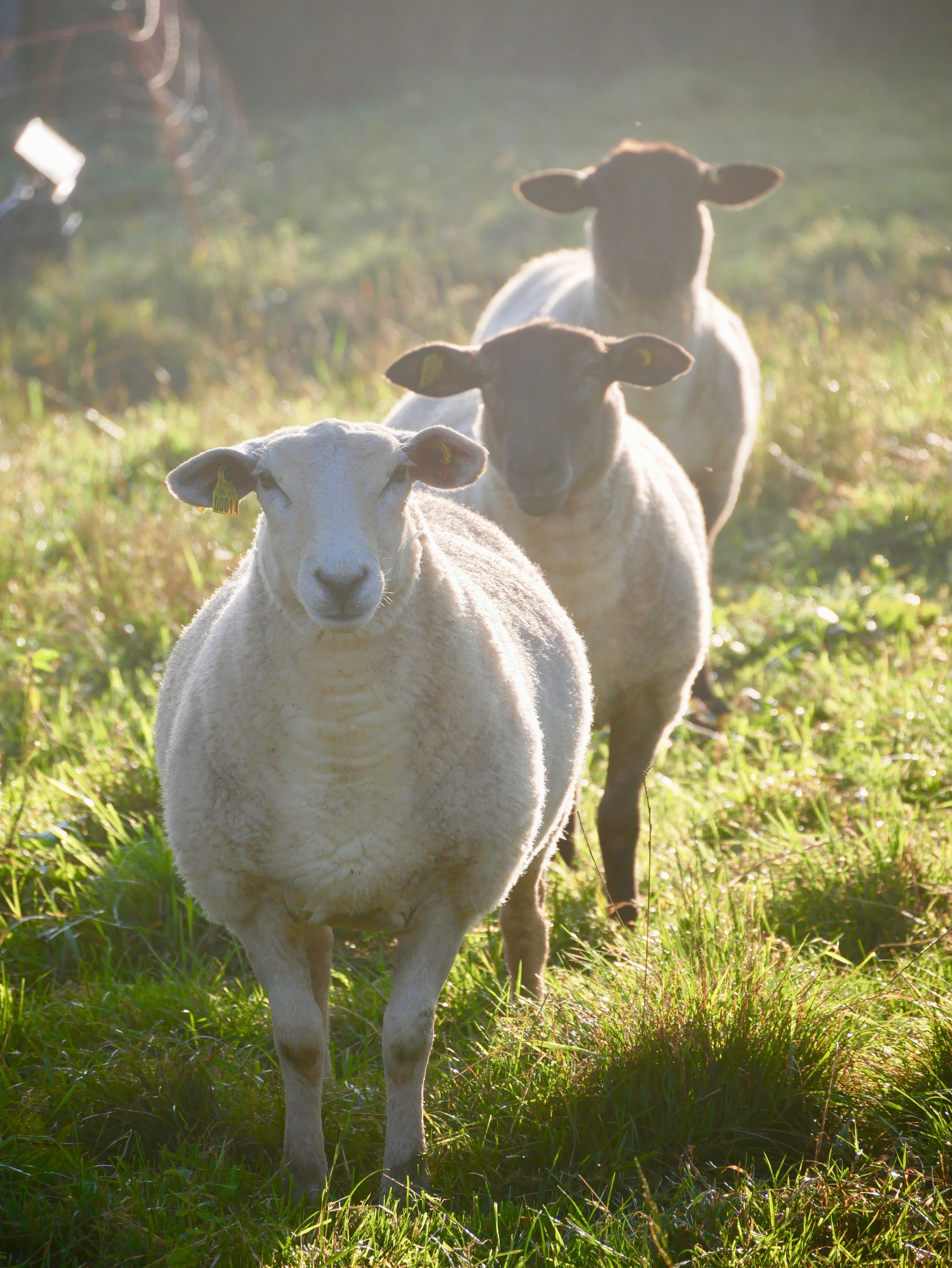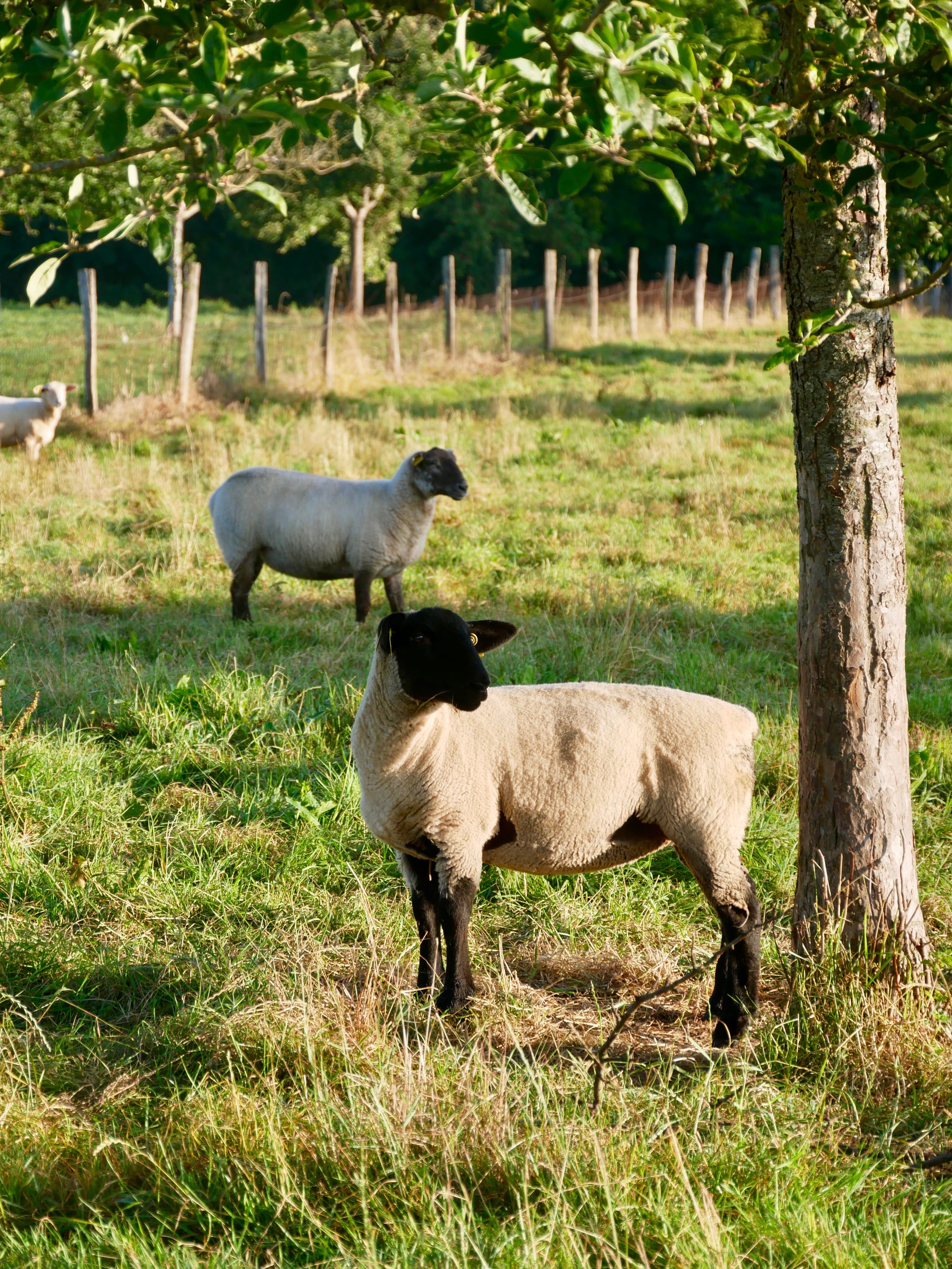 Les moutons sont également élevés en plein air. L'aliment principal de leur ration est l'herbe : pâturée ou sous forme de foin. Actuellement, le troupeau est composé de différentes races mais nous nous orientons petit à petit vers la race Suffolk.