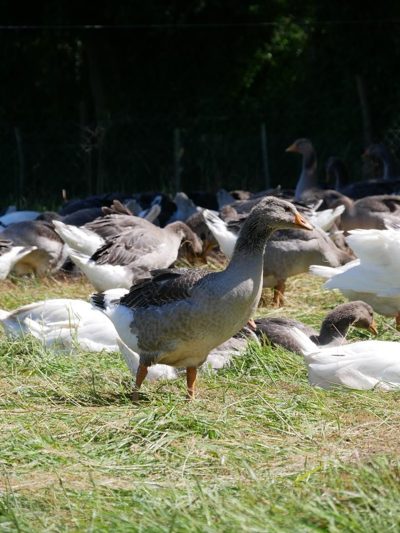 Les deux premières semaines, le bâtiment est bien chauffé pour être accueillant. Puis les animaux sortent dès que possible et découvrent le pâturage. Ils seront ensuite élevés dans les champs jour et nuit. Cette période dure minimum 20 semaines pour les oies, et 15 semaines pour les canards avant le gavage.